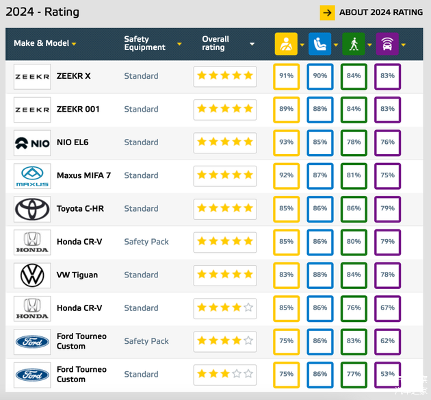 伴随着中国汽车的出海热潮,海外各大新车评级机构测试的中国品牌新车也越来越多。近日,欧洲两大新车评级机构Euro NCAP和Green NCAP公布了最新一批测试结果,极氪品牌在该榜单中的位置极为显眼,旗下两款车型 极氪001和极氪X在该两项评级中同时斩获最高等级的“五星”佳绩。尤为值得一提的是,在2024年现有Euro NCAP机构所测车型中极氪X和极氪001总体评分占据榜首位置,其中儿童乘员保护和安全辅助系统的评分更是领先于其他车型,目前该榜单还包括蔚来、大众、丰田、本田等品牌的多个车型。