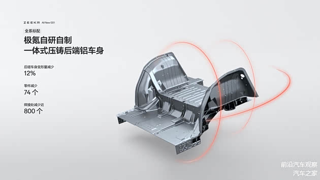 值得注意的是,在进入猎装2.0时代之后,升级焕新的全新极氪001的车身安全还将更进一步,全系标配一体式压铸后端铝车身,全新极氪001实现零件减少 74 个,焊接处减少近 800 个,在实际碰撞时变形量可减少12%,将纯电汽车的安全再度提升至全新维度。