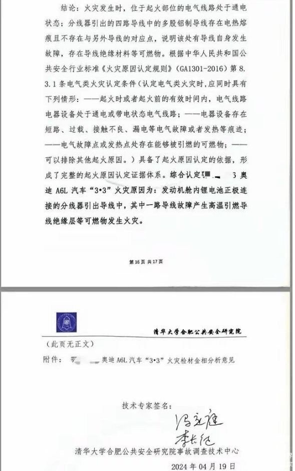 而发生自燃后,陈女士立即联系了事故鉴定中心对该自燃车辆展开鉴定工作。经过清华大学合肥公共安全研究院灾害事故调查技术中心鉴定后认定,事故车辆起火的原因是发动机舱内锂电池正极连接线故障,从而产生高温引燃了导线绝缘层等可燃物发生火灾,简而言之是车辆自身故障引发的自燃,这令不少人大吃一惊。