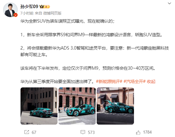 6月6日,众多汽车博主晒出了一组鸿蒙智行全新SUV谍照,下面这组图片来自博主@孙少军09。