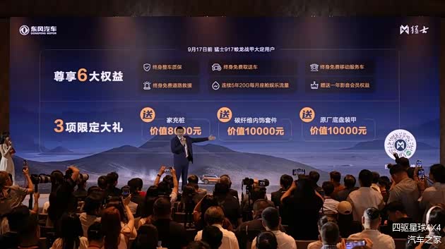 猛士917蛟龙战甲还推出了具有吸引力的预定政策: 9月17日前下定的大定用户,可享终身整车质保、终身免费取送车、终身免费移动服务车、终身免费道路救援、连续5年20G每月座舱娱乐流量、一年影音会员等6大权益。除此之外,还将赠送家冲充桩、碳纤维内饰套件、原厂底盘装甲等3项限定大礼,总价值达到28000元。