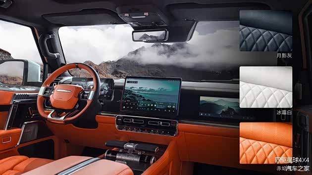 内饰方面,猛士917蛟龙战甲同样不遗余力地追求豪华与科技感的完美结合。猛士917蛟龙战甲提供月影灰、冰霜白、赤焰橙三种内饰配色,其中冰霜白、赤焰橙两款车色灵感源自中国龙文化,龙呵气成云,为水为火。水为冰霜,象征冷静勇毅,不染纤尘;火为赤焰,象征热情奔放、忠诚守护。此外,蛟龙战甲还对内饰材质进行了升级,标配Napa真皮座椅、麂皮车顶,同时内饰木纹件还可改装为碳纤维材料,豪华度拉满,比肩世界顶级豪车。