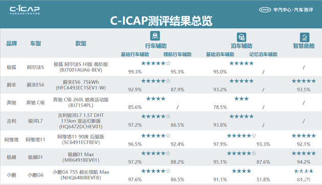 截至目前,C-ICAP(1.1版)已累计发布极狐 阿尔法S HI版 高阶版、蔚来ES6 75kWh、奔驰 C级 260L 皓夜运动版、阿维塔11 90度 后驱版、吉利银河L7 1.5T DHT 115km 亚运幻影版、极越01 Max、小鹏G6 755 超长续航 Max 7款车型测试结果。