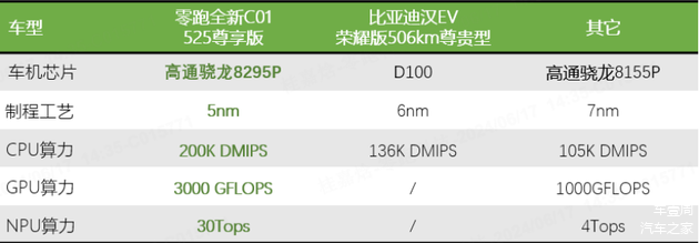 通过数据比较可以直观看到,高通8295相较于同级许多车型搭载的高通8155具有明显的代际差异,和比亚迪汉EV搭载的D100芯片相比,全新C01的8295智能座舱芯片在制程工艺、各种算力上数据有较大的领先优势,全新的芯片兼具高带宽、低时延、大容量等优势,在软件响应、指令执行、影音娱乐等用户感受方面的体验进一步升级。