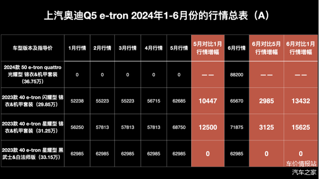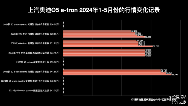 Q5 e-tron在售的版本中,4155版本行情变化最大,相比1月份优惠增加了20775元(5个点),相比上个月也有8310元的优惠增长(2个点)。而3315版本最为奇怪,从1月到现在行情没有任何变化。