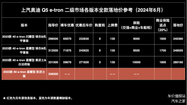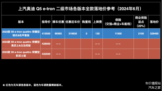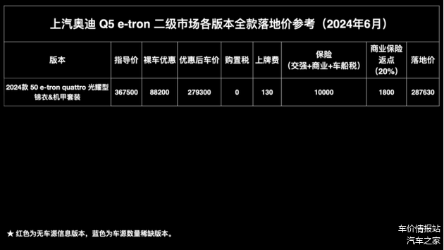 商业保险返点:从二级市场目前的即时行情来看,Q5 e-tron绝大多数车源可以做到裸车或者交强销售,这意味着商业保险可以自行购买,不同于燃油车,新能源车型返点要少很多,这款车型商业保险的返点一般可以做到20-30个点的返点,意味着只要操作得当,保险这一块又可以节省几千元不等。