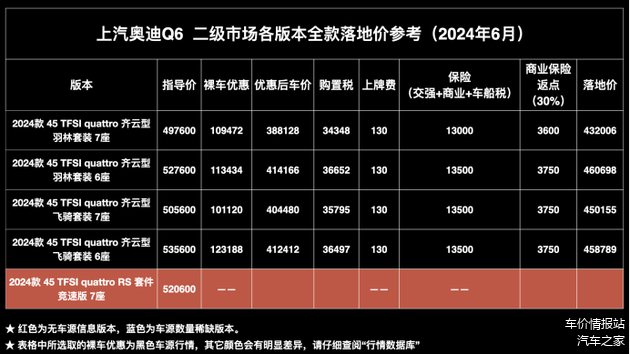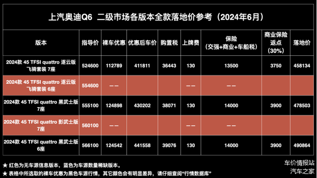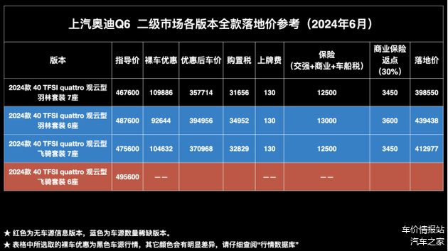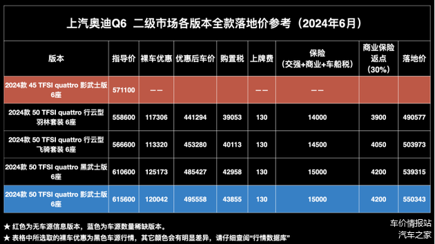 商业保险返点:从二级市场目前的即时行情来看,Q6绝大多数车源可以做到裸车或者交强销售,这意味着商业保险可以自行购买,而这款车型商业保险的返点一般可以做到30-40个点的返点,意味着只要操作得当,保险这一块又可以节省几千元不等。