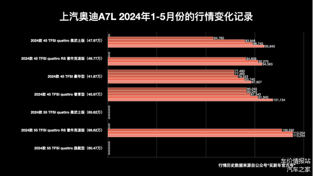 A7L在售的新版本中,行情变化最大的是4797版本,相比于2月份刚刚发售的时候,优惠提升了33579(7个点)。变化最小的是顶配的6662版本,优惠只提升了9993(1.5个点)。