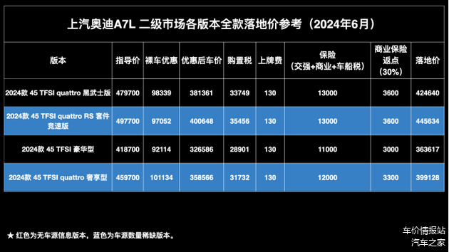 商业保险返点:从二级市场目前的即时行情来看,A7L绝大多数车源可以做到裸车或者交强销售,这意味着商业保险可以自行购买,而这款车型商业保险的返点一般可以做到30-40个点的返点,意味着只要操作得当,保险这一块又可以节省几千元不等。