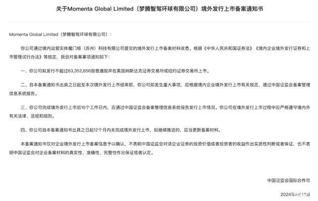 6月17日,证监会发布了《关于Momenta Global Limited(梦腾智驾环球有限公司)境外发行上市备案通知书》。