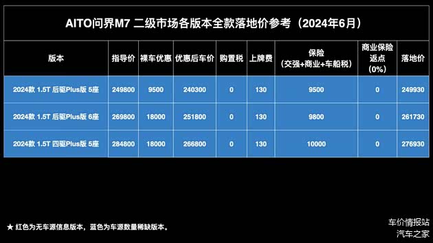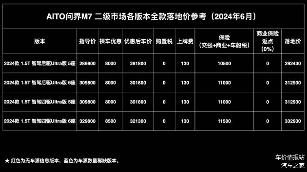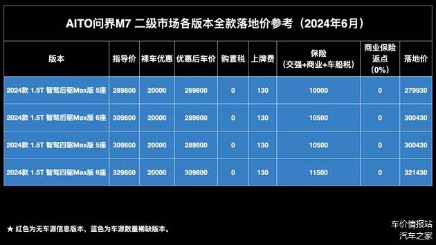 商业保险返点:从二级市场目前的即时行情来看,24款问界M7无论老款还是新款,目前都没有看到交强和裸车车源信息,保险暂时需要在车商或渠道处购买。