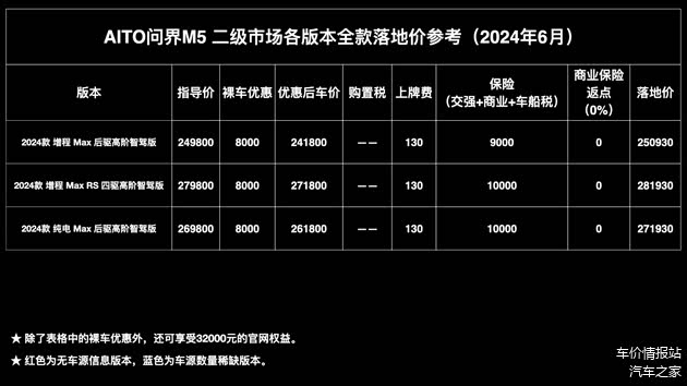 商业保险返点:从二级市场目前的即时行情来看,24款问界M5因为刚刚上市的原因,目前还没有看到交强和裸车车源信息,保险暂时需要在车商或渠道处购买。
