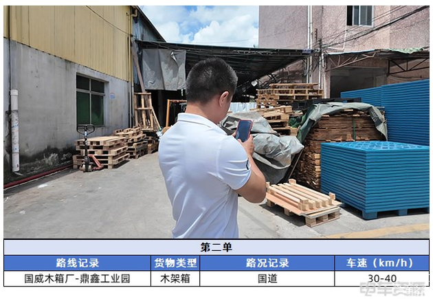 第二单同样在东莞市内,货物为木架箱,整体的重量不到50kg,整个配送里程为45km,消耗21%电量。