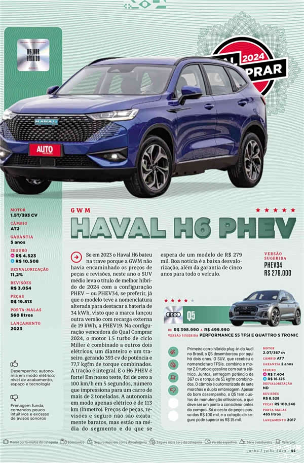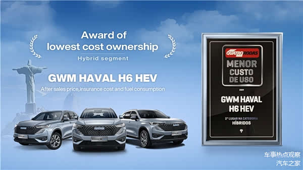同样在6月份,哈弗H6 HEV还荣获巴西另一家权威汽车测评媒体“四驱杂志”(Quatro Rodas)颁发的“混动车型最低用车成本奖”。四驱杂志的“最低用车成本奖”是巴西汽车行业中备受关注和尊敬的奖项之一,它综合考评了车辆使用成本的多个因素,涵盖维护费用、燃油消耗、保险费、汽车税和折旧率等。在混动汽车类别的所有竞争对手中,哈弗H6 HEV是折旧率最低、最保值的车型。