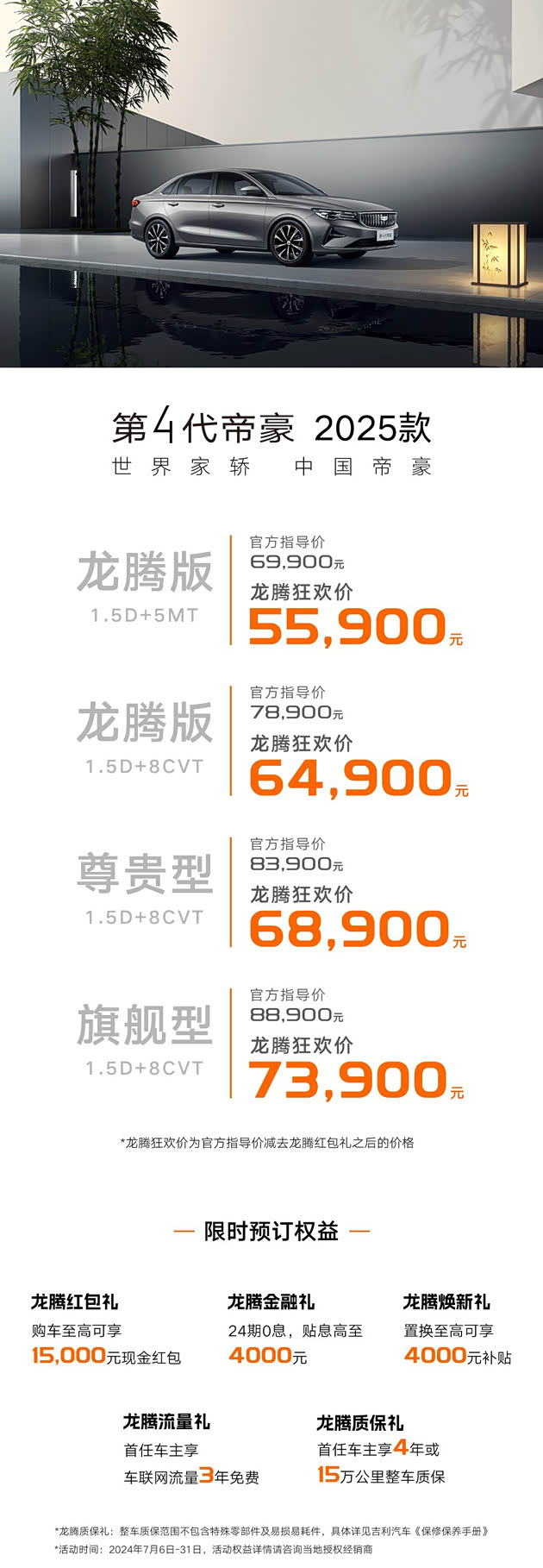 2024年7月6日,吉利第4代帝豪2025款正式上市,指导价6.99万~8.89万元,但是购车可享至高15000元现金红包,实际的龙腾狂欢价仅为5.59万~7.39万元。