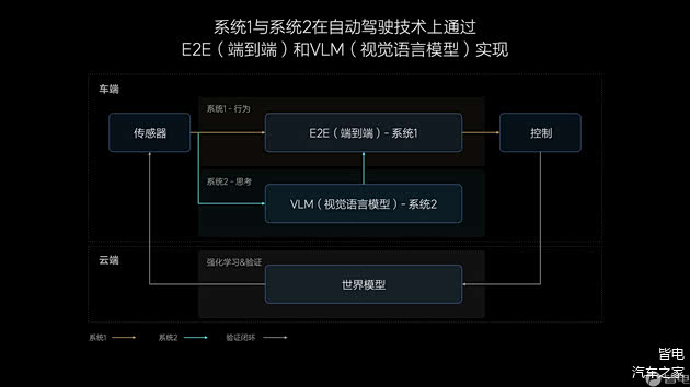 理想汽车基于快慢系统系统理论形成了自动驾驶算法架构的原型。系统1由端到端模型实现,具备高效、快速响应的能力。端到端模型接收传感器输入,并直接输出行驶轨迹用于控制车辆。系统2由VLM视觉语言模型实现,其接收传感器输入后,经过逻辑思考,输出决策信息给到系统1。双系统构成的自动驾驶能力还将在云端利用世界模型进行训练和验证。