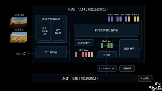 VLM视觉语言模型的算法架构由一个统一的Transformer模型组成,将Prompt(提示词)文本进行Tokenizer(分词器)编码,并将前视相机的图像和导航地图信息进行视觉信息编码,再通过图文对齐模块进行模态对齐,最终统一进行自回归推理,输出对环境的理解、驾驶决策和驾驶轨迹,传递给系统1辅助控制车辆。