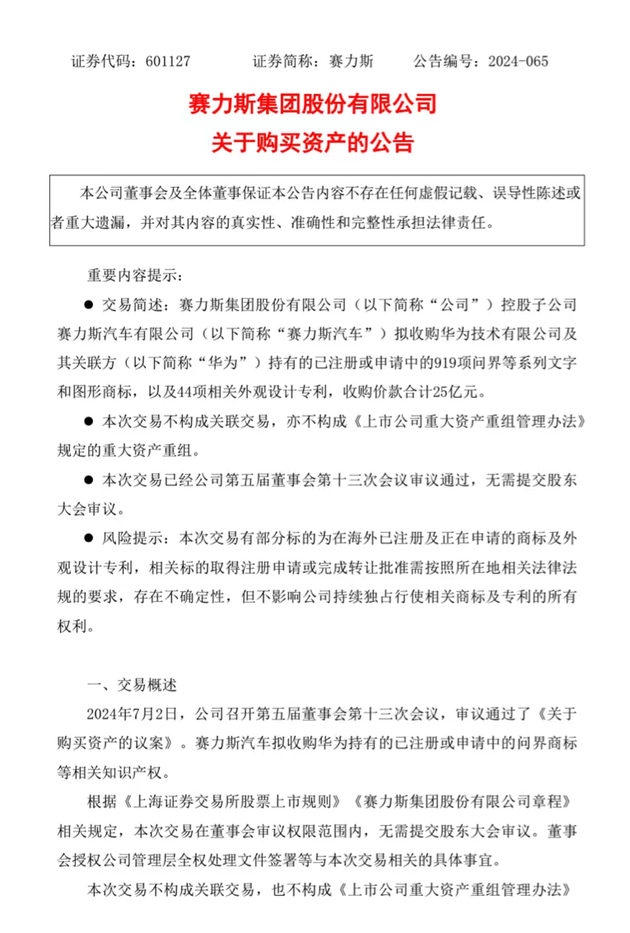 7月2日,赛力斯公告,公司控股子公司赛力斯汽车有限公司拟收购华为技术有限公司及其关联方持有的已注册或申请中的 919 项问界等系列文字和图形商标,以及 44 项相关外观设计专利,收购价款合计 25 亿元。