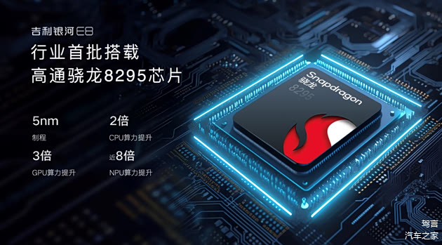 更重要的内饰部分,E8为了能将定位下探至更低年龄区间,车门设计不单采用年轻人所拥护的无框式车门设计,同时内装设计部分还采用吉利体系品牌惯用的极简+游艇式环抱座舱设计。为了进一步提升座舱科技感,银河E8还全系大胆标配45英寸8K分辨率超大屏幕,为了支撑8K分辨率流畅度以及5G信号稳定性,E8直接配备高通8295车机芯片,大幅满足APP运行算力同时,基于5nm先进制程,8295相比上一代8155芯片,拥有4倍STR快启效能和更低运行功率。