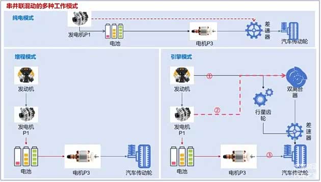 通过这套系统,加之比亚迪自研的AI能耗管理算法,可以实现包括:P1电机直驱,P1+P3电机并联直驱,P1+P3+发动机三者并联驱动,发动机驱动P1发电再由P3驱动,发动机直驱等多种工况。