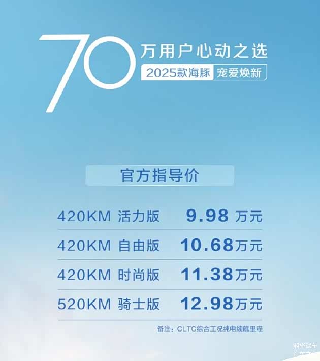 在动力上,2025款海豚也进行了细微调整,比如活力版、自由版、时尚版搭载的是最大输出功率70kw的电机,搭载44928千瓦时的比亚迪刀片电池,CLTC纯电续航为420km。而骑士版则是换装了功率达到150kw的电机,最大扭矩310N.m,搭载容量为60.48千瓦时的磷酸铁锂电池组,CLTC工况续航里程为520公里,都在2024款的骑士版海豚上有了一个提升。