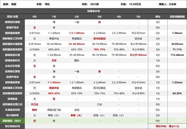 拆掉前保险杠,能看到一根双层辊压工艺的防撞钢梁,厚度为1.56毫米,覆盖车头的71.11%。