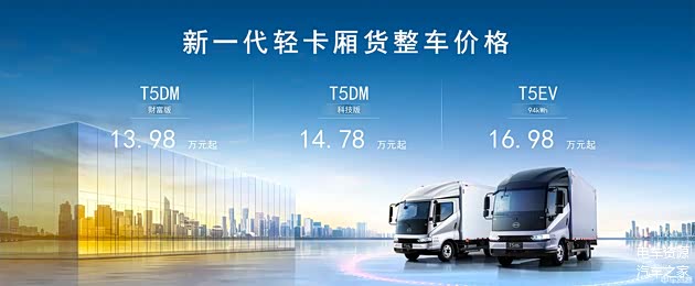 2024年1月,比亚迪T5系列轻卡发布,全系售价区间为13.98万-16.98万元,将新能源轻卡价格锁定在14万元。这一举措,率先在新能源商用车市场点燃了“油电同价”的战火。