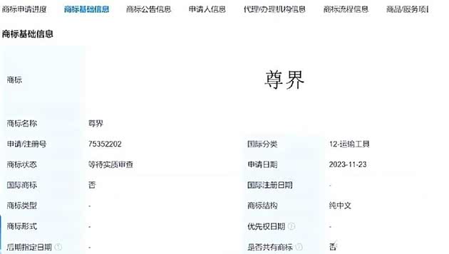 余承东还在述说过程中第一次提到了“尊界”。余承东将“问界、智界、享界、尊界”并列说出,这无疑是下一个合作品牌的名称。实际上尊界商标去年底就和其它几个“界”被华为申请。有媒体称尊界品牌将会是和江淮汽车的合作品牌,并且对标的品牌是迈巴赫。
