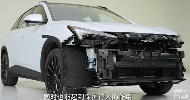 首先是车身的基础防护,汽车被碰击,第一当然就是车体的基础防护起作用,拆车视频里也可以看到保险杠下极狐阿尔法 T5前后两端的防撞梁体使用的是铝合金梁体和钢制材料,尤其是车头的防撞梁,最上方有一根尺寸巨大的缓冲发泡梁体,下面还做了一套塑料材质的缓冲支架。这两类结构都可以在低速碰撞中缓冲吸能减少车辆损失,同时也能起到保护行人的作用,但光是这些还不够,最下面极狐还加了宽度达 1, 290 毫米的铝合金梁体,从正面看可以看到这根梁体上下有两段,上面这段是一根完整梁体,截面类似目字型结构。下面这段为了避让主动进气格栅中间这块截掉了,但两段梁体背后都连接着吸能盒,这个吸能盒的截屏尺寸也是巨大,应对碰撞中能够起到不小的吸能作用,一层盖一层,极狐真的是够下本的。