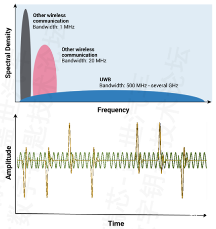 UWB(Ultra Wide Band)即超宽带技术,是一种无线载波通信技术。UWB通过发送和接收具有纳秒甚至亚纳秒级的极窄脉冲来传输数据,一个信息比特可映射为数百个脉冲,因此其所占的频谱范围很宽。