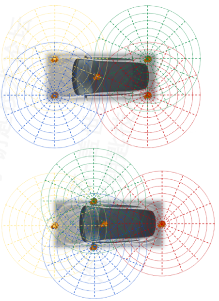 如果再增加一个锚点,实现车内双AoA锚点,可以很好的解决车身A、B、C柱的遮挡。但车内双AoA锚点方案依然存在锚点放置位置受限、遮挡场景定位相对困难的问题。同时UWB测距在遮挡场景下,很大程度上可以形成有效测距,但测角一旦遮挡,角度信息基本不可用,而且高端车客户还青睐于金属贴膜,如果做车内锚点,就不能贴好的金属膜。