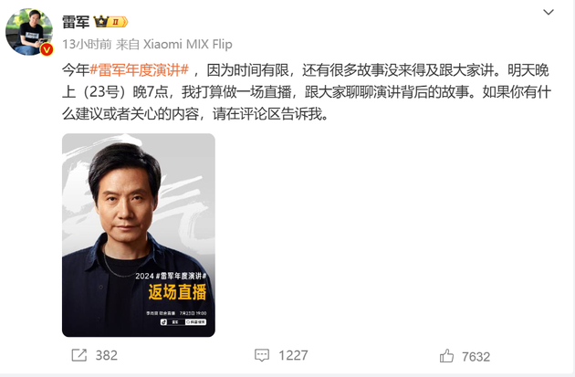 7月22日,小米创始人、董事长兼 CEO 雷军宣布,要在7月23日晚7时开启一场演讲返场直播,跟网友聊聊今年年度演讲背后的故事。