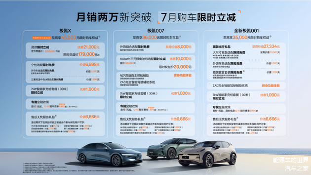 极氪001在7月份推出了至高35000元的限时购车优惠,包括免费选配的大尺寸轮毂、外饰车色和猎装露营套装等。此外,极氪X至高享45000元限时购车权益,极氪007也提供最高可达3.6万元的限时购车优惠。