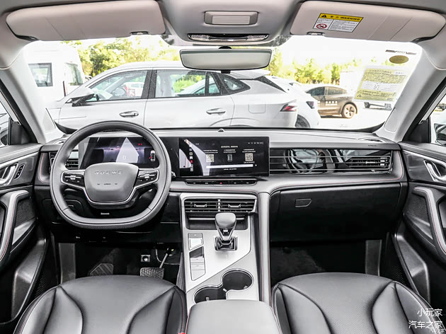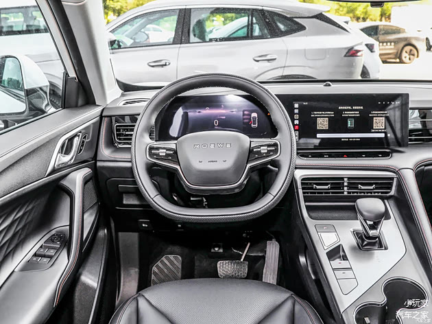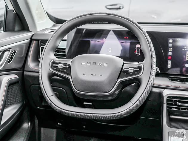 进入荣威D5X DMH的内部,可以很明显感觉到其沿用了RX5的部分设计,整体结构比较像,强调横向视觉宽度,使用了较多的平直线条。材质方面很用心,软性材质、麂皮、不同色系面料划分出不同的功能区域,不缺乏质感上的呈现。皮质方向盘呈“D”字形,与其“D家族”身份相吻合,在四向调节的加持下,不同身材的人坐进去都能获得良好的行车姿势。