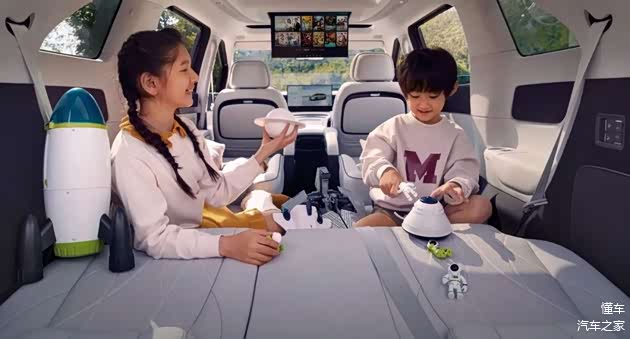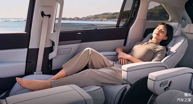 内饰部分换装全新的方向盘样式以及面板纹理,中控车机系统升级并搭载了双8295芯片,配备冷暖恒温冰箱,6座车型还配备了17.3英寸后排吸顶屏,常见的新势力三件套齐活儿了。