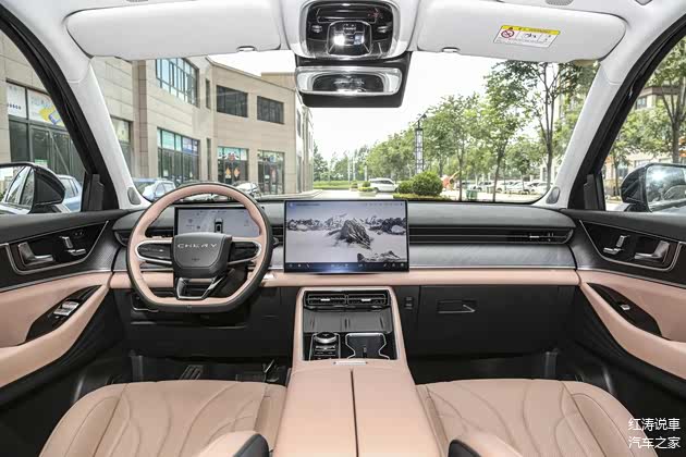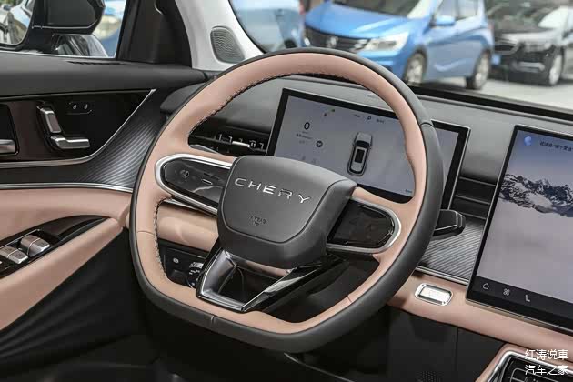 瑞虎8L的内饰颇有些新能源汽车的味道,车内的实体按键比较少,中控台呈现出环抱座舱布局,使用了大量软性材质覆盖和皮质包裹,中间部分还应用了木纹饰板来提升质感,10.25英寸液晶仪表、15.6英寸悬浮式中控屏以及电子怀挡机构,营造出科技氛围,车机内置高通骁龙8155芯片。