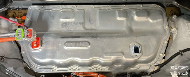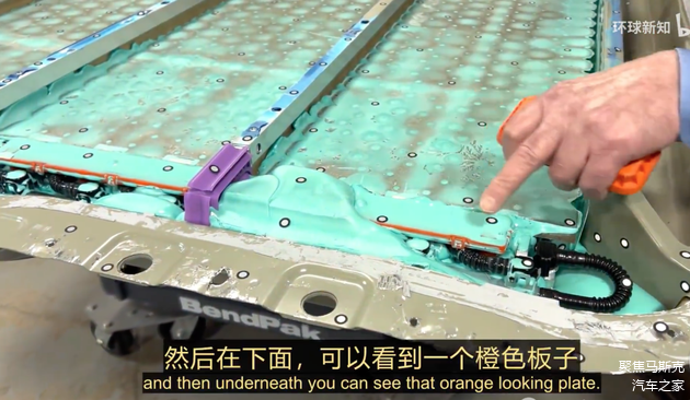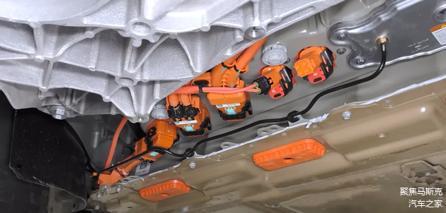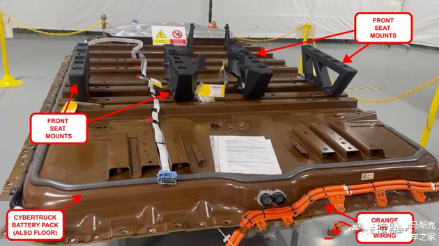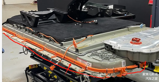 在电池包的侧面,有一组橙色的高压线束,该线束到前驱动的线束(Cybertruck是双电机)之前看保时捷的设计也是把驱动动力线放在PACK侧面,印象中 至少有3-4家都是这种走线方式,相对来说,也只能把线束走的侧面,虽然侧面在发生碰撞的时候可能会损害该线束。