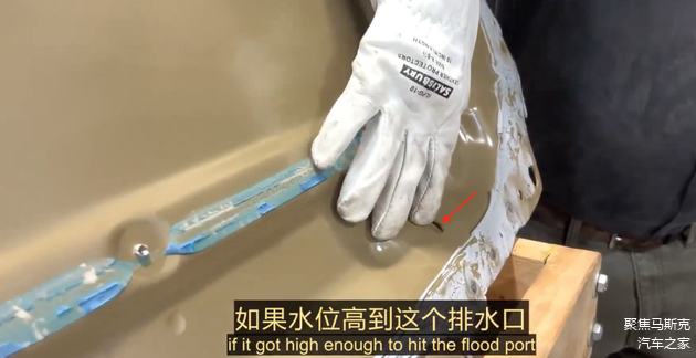 最后一项是对电池底部排水阀的设计。红色箭头标识了电池底板排水口的位置,当水位高于这个口时,第二张图中排水阀内部的圆片会吸水膨胀,将顶部顶开,从而将水排出。这样的设计也为越野工况提供了便利,驾驶者不必担心电池泡水的安全问题。