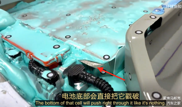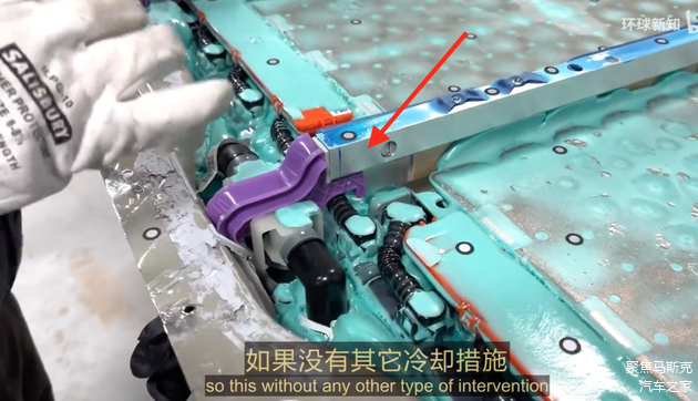 这种通过取消物理模组而直接将电芯粘成一个整体的做法,可以加强电池包的整体机械强度。为了在发生热失控时保护乘客舱,特斯拉将电芯倒置(与小米SU7的麒麟电池类似),这样热失控的电芯可以向下排出高温气体及化学物质,同时下图标识出了云母板,也在一定程度给予隔热保护。