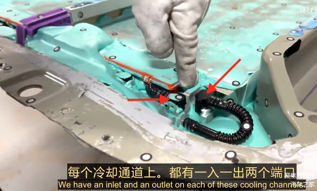 每个冷却板都包含冷却管入口和出口,与Model Y设计一致,但目前这些管路的具体排布尚不明确,需在后续拆解过程中探究,下面的第二张图展示了整个电池包的总冷却出入口。