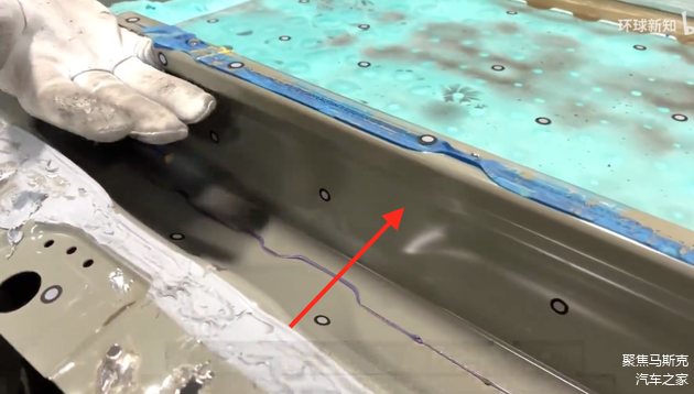 除了电池倒置、云母板和排气阀,下图的电池外壳体和电池主体边粱之间纵向的空间也为排气制造了便利通道,它的另一个功能是作为侧面碰撞的缓冲区。而且在第二张图中还发现了电池主体边粱的内侧设计了一些矩形排气口。