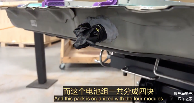 下面我们来看下电池底部独特的空间设计。下图左侧时电池底板,汽车行驶过程中面对着路面,而在底板的上方,4个区域之间的纵梁做了加高处理,为电池本体和底板提供了25mm左右的缓冲区,这样做是为了降低越野过程中树干和石头对电池的撞击损伤。