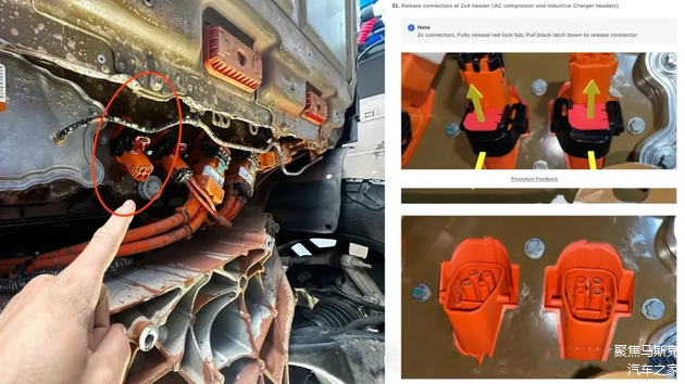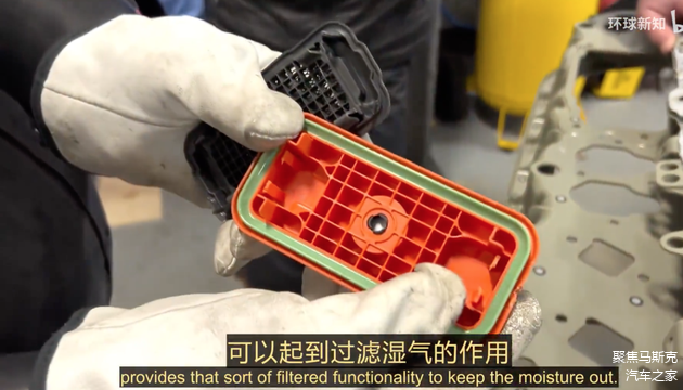 在FDU电池端这一侧有一些长方形中间有圆孔的橙色塑料结构,这是特斯拉设计的透气阀。