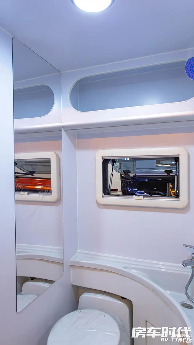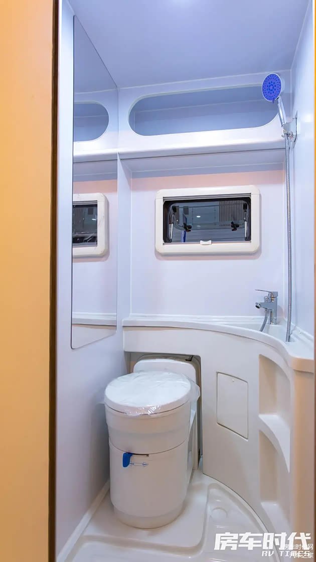 卫浴间采用了干湿一体式设计,内部配置房车专用洗手盆、淋浴花洒系统、进口旋转马桶、梳妆镜、储物格等,满足车友的淋浴洗漱需求。水路系统方面,本车配备有400L清水箱、80L灰水箱。电路系统方面,本车配备有48V 30度锂电、6000W逆变器、1700W太阳能等。