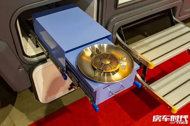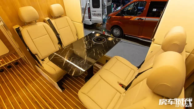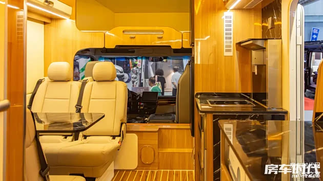 中部会客区对卡座设计,中间配备可升降餐桌,需要时此处区域可临时拼床使用。另外桌面还内嵌有电磁炉,车友可以在此煮茶谈天,带来更多样的使用体验。驻车时可以将会客区域的侧舱门打开,尽情欣赏户外风景。