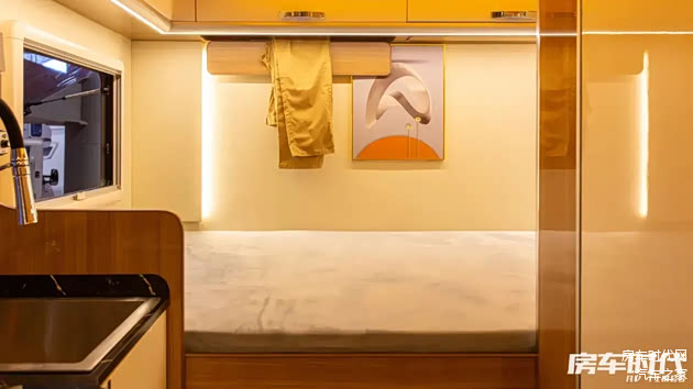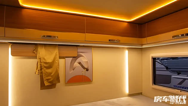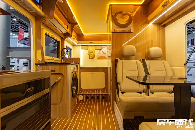 内饰采用米白加原木的配色,带来雅致清新的氛围,加上内部的暖色灯光,更添了几分精致和温馨的质感。内饰布局清晰,采用经典C型房车布局,前方为驾驶室、额头床,中部为会客区、厨房区,尾部为休息区、卫生间。