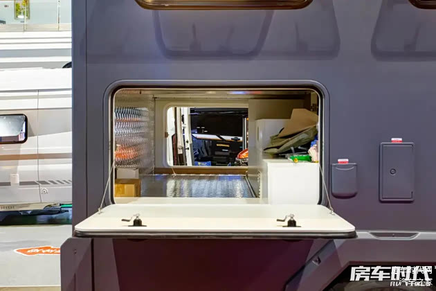 车辆外侧配备了加水口、充电口、柴油户外灶、上车踏步、户外遮阳棚、户外灯带等设施,丰富用户的户外露营生活。另外再尾部区域,本车还配备有贯通式储物仓,方便用户存储旅途所需的大件行李物品,方正的造型设计让车友拿取物品时也更加方便。