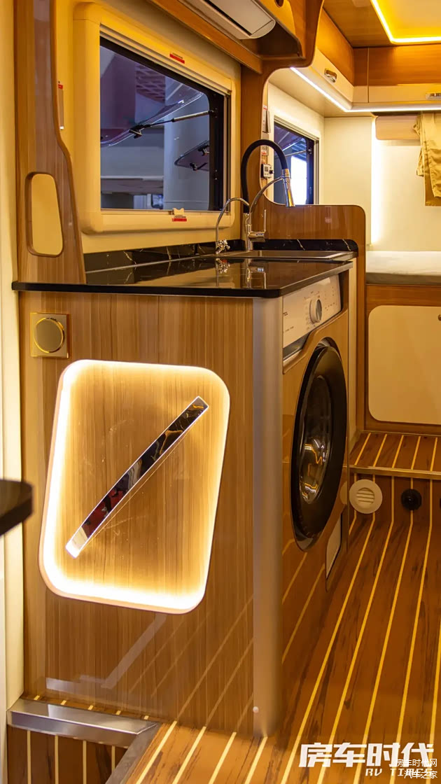 厨房区域分为两处,一处台面配备有洗菜池、水龙头,下方配备有8公斤洗衣机,方便车友旅途中的衣物换洗。另外一侧设施更是齐全,简直将家用厨房设施搬到了车里,配备有电陶炉集成灶(油烟机、消毒、保温)、下排烟系统、双冰箱(英得尔76L)等。