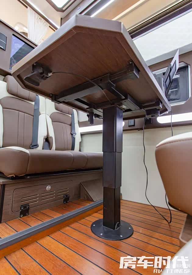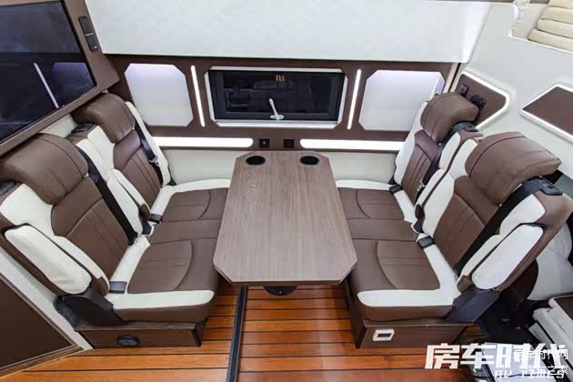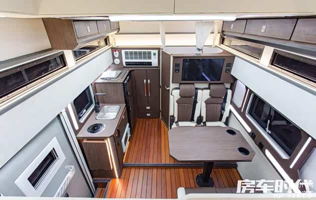 生活区采用了四人对坐会客空间设计,内饰以深咖和木纹为主,墙体做了环保皮革内饰,内部铺设游艇木地板,整体呈现雅致的旅居氛围。驻车后将车厢的升顶结构展开,两侧会出现多个矩形窗口,为车厢内部带来了充裕的自然采光。