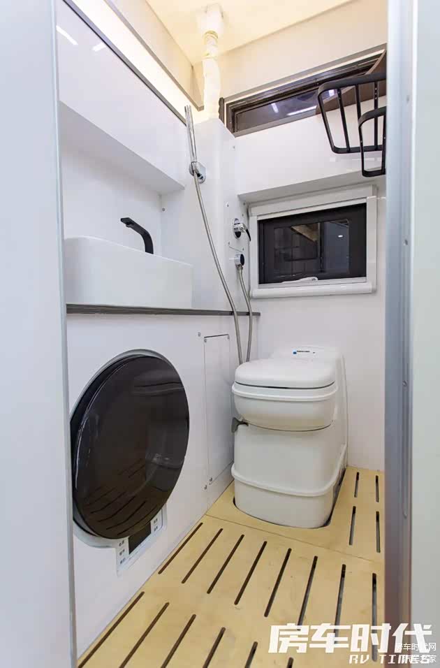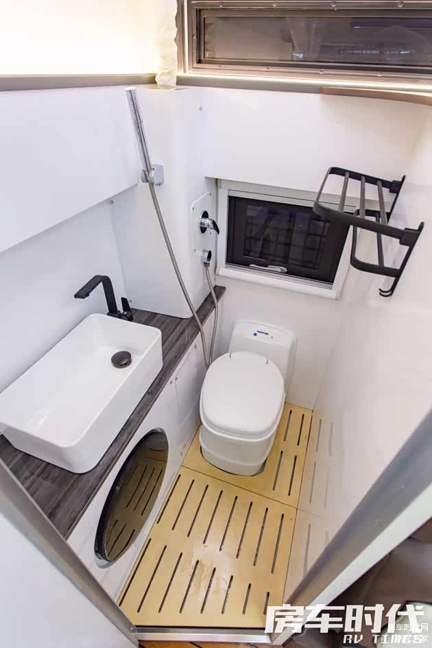 固定卫生间为干湿一体式设计,内部配置台盆式水池、抽拉马桶、毛巾架、淋浴花洒等,卫浴设施齐全,升顶后配合防水浴帘可以形成一个空间可观的淋浴空间。